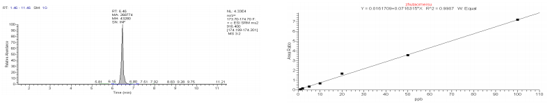 选同类型空白鱼肉样品,按上述前处理方法进行操作,收集过柱流出液,分别取流出液 300 µL 加入适量大环内酯标准溶液,再以 10 mM 甲酸铵定容至 1 mL,得到曲线浓度分别为 1 ng/mL、2 ng/mL、5 ng/mL、10 ng/mL、20 ng/mL、50 ng/mL、100 ng/mL 的上机溶液。四、仪器条件