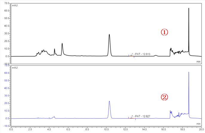 (①苹果醋样品-未净化处理 ②Copure® 228多功能净化板-净化处理 )