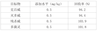 表 2 0.5 mg/kg 韭菜中农药多残留的添加回收结果