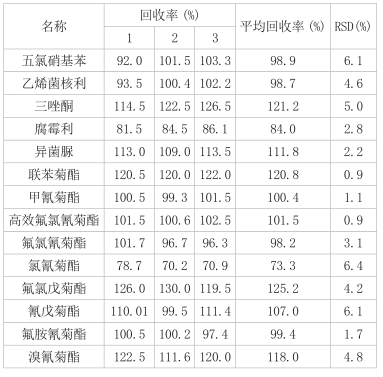 表 4 0.2 mg/kg 大米中有机氯类、拟除虫菊酯类农药多残留的添加回收结果