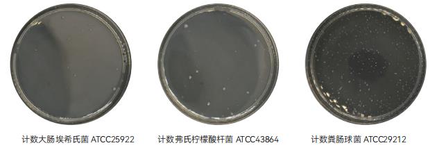 | 1. 大肠埃希氏菌 ATCC25922 在 VRBA 板上的菌落特征:有或无沉淀环的紫红色或红色菌落; 2. 弗氏柠檬酸杆菌 ATCC43864 在 VRBA 板上的菌落特征:有或无沉淀环的紫红色或红色菌落 ; 3. 粪肠球菌 ATCC 29212 在 VRBA 板上的菌落特征:选择性 G<5; |
