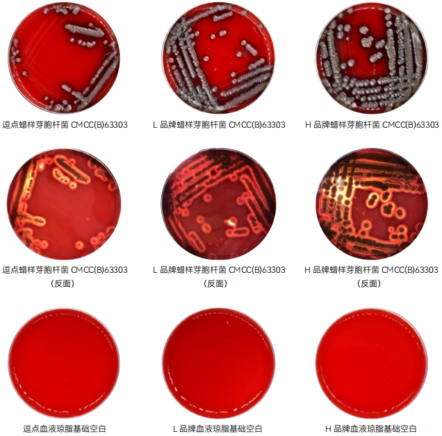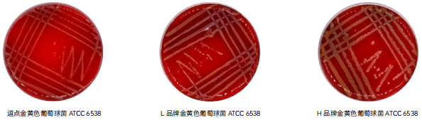 1. 特异性 :目标菌金黄色葡萄球菌 ATCC 6538、蜡样芽胞杆菌 CMCC(B)63303,逗点、L 品牌、H 品牌均满足国标生长特性溶血现象的要求,逗点、H 品牌溶血现象明显,L 品牌溶血现象较弱。逗点生长速度较缓慢。