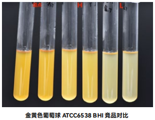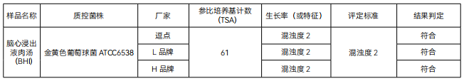1. 生长率 :目标菌金黄色葡萄球 ATCC6538 逗点、L 品牌、H 品牌的混浊度满足要求 ;