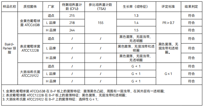 1、生长率 :目标菌金黄色葡萄球 ATCC6538, L 品牌、 H 品牌、逗点均满足国标在 Baird-Parker 上> 10Cfu, 菌落黑色凸起,周围有一混浊带,在其外层有一透明圈的要求