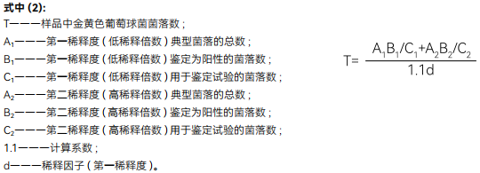 根据上面的公式计算结果 , 报告每 g(mL) 样品中金黄色葡萄球菌数 , 以 CFU/g(mL) 表示 ; 如 T 值为 0, 则以小于 1 乘以最低稀释倍数报告。