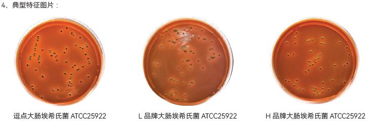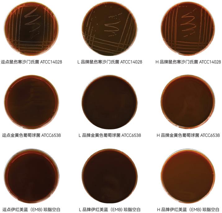 1、生长率:目标菌大肠埃希氏菌 ATCC25922,逗点、L品牌、H品牌均满足国标PR≥0.5;黑色菌落,具金属光泽的要求;且三家无明显差异。