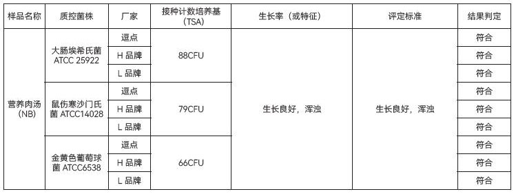 1、生长率:目标菌大肠埃希氏菌ATCC25922 、鼠伤寒沙门氏菌 ATCC14028、金黄色葡萄球菌 ATCC6538,逗点、L品牌、H品牌的混浊度 、生长现象均满足要求;24±2h培养后浑浊度均达到2。