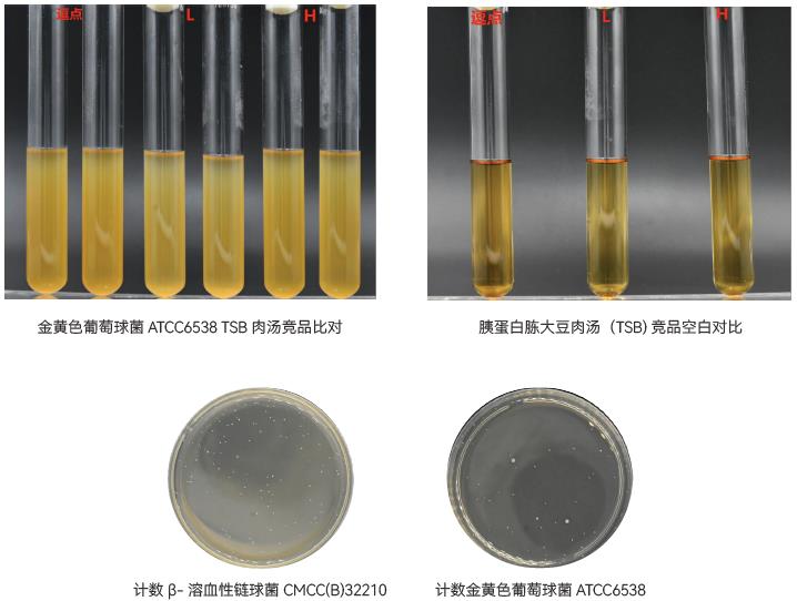1、生长率:目标菌 β-溶血性链球菌CMCC(B)32210 、金黄色葡萄球菌 ATCC6538,逗点、L品牌、H品牌的混浊度 、生长现象均满足要求;