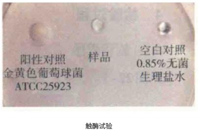4.2.3.3触酶试验 挑取可疑菌落于洁净的载玻片上,滴加适量3%过氧化氢溶液,立即产生气泡者为阳性。β型溶血性链球菌触酶为阴性(见下图)。
