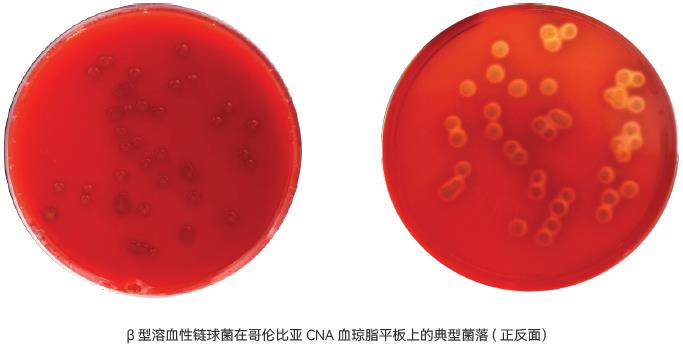 哥伦比亚CNA血琼脂平板上如有β型溶血性链球菌落出现,应与金黄色葡萄球菌区别。后者在哥伦比亚CNA血琼脂平板上,菌落较大,呈金黄色(有时为白色),菌落周围可见完全透明溶血圈。β型溶血性链球菌在哥伦比亚CNA血琼脂平板上呈灰白色、半透明或不透明、光滑、表面突起、边缘整齐,周围有无色透明溶血圈。