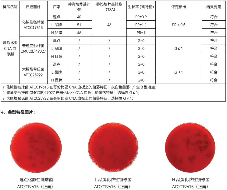1.生长率:目标菌化脓性链球菌ATCC19615,逗点、L品牌、H品牌均满足国标PR≥0.5的要求,逗点、H品牌、L品牌都有产生β型溶血。