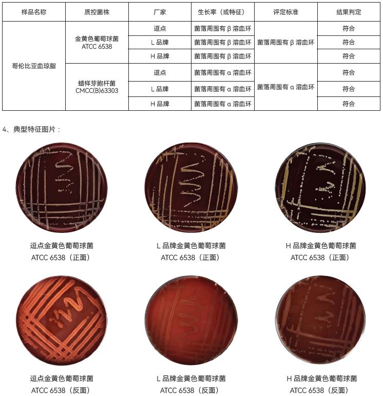 1.特异性:目标菌金黄色葡萄球菌 ATCC 6538、蜡样芽胞杆菌 CMCC(B)63303,逗点、L品牌、H品牌均满足国标生长特性溶血现象的要求,逗点、H品牌溶血现象明显,L品牌溶血现象较弱。逗点生长速度较缓慢。