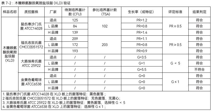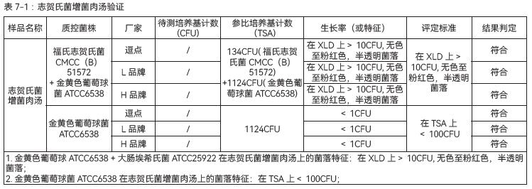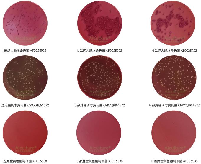 4.1 生长率:目标菌福氏志贺氏菌 CMCC(B)51572+ 金黄色葡萄球菌 ATCC6538,逗点、L 品牌、H 品牌均满足国标在XLD 上> 10CFU,