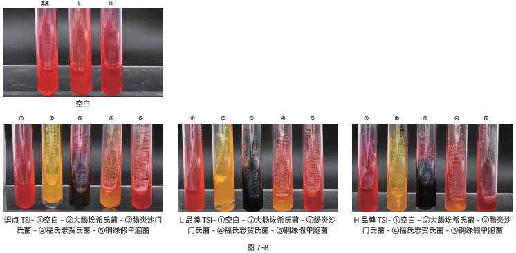 ①斜面产碱呈红色且底层产酸呈黄色(发酵葡萄糖,不发酵乳糖、蔗糖);