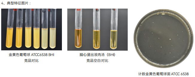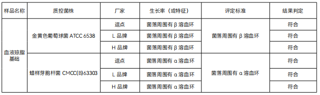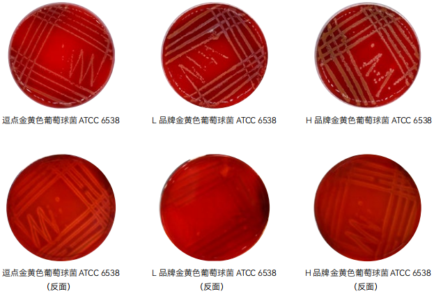 1. 特异性 :目标菌金黄色葡萄球菌 ATCC 6538、蜡样芽胞杆菌 CMCC(B)63303,逗点、L 品牌、H 品牌均满足国标生长特性溶血现象的要求,逗点、H 品牌溶血现象明显,L 品牌溶血现象较弱。逗点生长速度较缓慢。