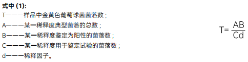 根据上面的公式计算结果 , 报告每 g(mL) 样品中金黄色葡萄球菌数 , 以 CFU/g(mL) 表示 ; 如 T 值为 0, 则以小于 1 乘以最低稀释倍数报告。