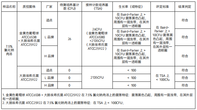 1. 生长率 :目标菌金黄色葡萄球 ATCC6538 逗点、L 品牌、H 品牌的混浊度满足要求 ;