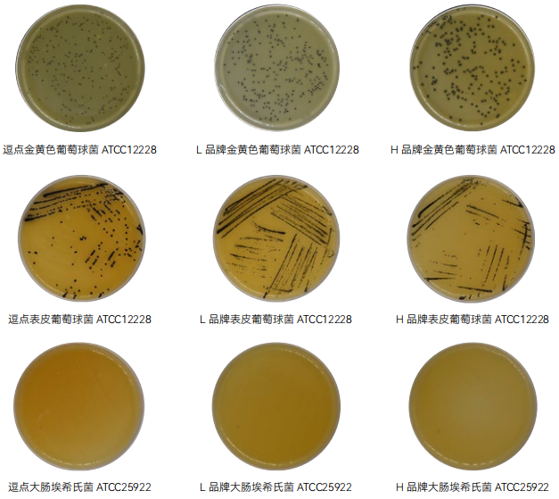 2、选择性 :大肠埃希氏菌 ATCC25922, L 品牌、 H 品牌、逗点均符合国标在 TSA 上< 100Cfu 要求。