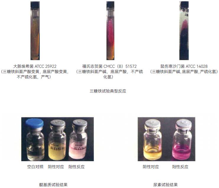 4.4.1 三糖铁试验 广泛用于肠杆菌科细菌的鉴定,通过观察细菌对糖的利用和硫化氢的产生,获得对细菌种属的初步判断。三糖铁琼脂培养基含有乳糖、蔗糖和葡萄糖的比例为10:10:1。如细菌只利用葡萄糖,葡萄糖被分解后产酸可使斜面先呈黄色,但因葡萄糖量少,生成的少量酸可因接触空气而氧化,加之细菌生长繁殖利用培养基中的含氮物质生成碱性化合物,使斜面部分后来又变成红色;底层由于处于缺氧状态,生成的酸类不被氧化而仍保持黄色。如细菌能够利用乳糖或蔗糖,产生大量的酸,使培养基斜面与底层均呈现黄色;同时也会产气,使培养基出现气泡或断层。某些细菌能分解含硫氨基酸,生成硫化氢,硫化氢和培养基中的铁盐反应,生成黑色的硫化亚铁沉淀,使培养基呈现黑色。常见的三糖铁试验有以下几种反应:a.斜面产碱/底层产碱:不发酵葡萄糖、乳糖和蔗糖,是非发酵型细菌的特征,如铜绿假单胞菌;b.斜面产碱/底层产酸:发酵葡萄糖、不发酵乳糖和蔗糖,是不发酵乳糖型细菌的特征,如志贺菌;c.斜面产碱/底层产酸(黑色):发酵葡萄糖、不发酵乳糖和蔗糖、产生硫化氢,是产硫化氢不发酵乳糖型细菌的特征,如大多数的沙门菌、柠檬酸杆菌和变形杆菌等;d.斜面产酸/底层产酸:发酵葡萄糖、乳糖、蔗糖,是发酵乳糖型细菌的特征,如大肠埃希菌、克雷伯菌属和肠杆菌属等。