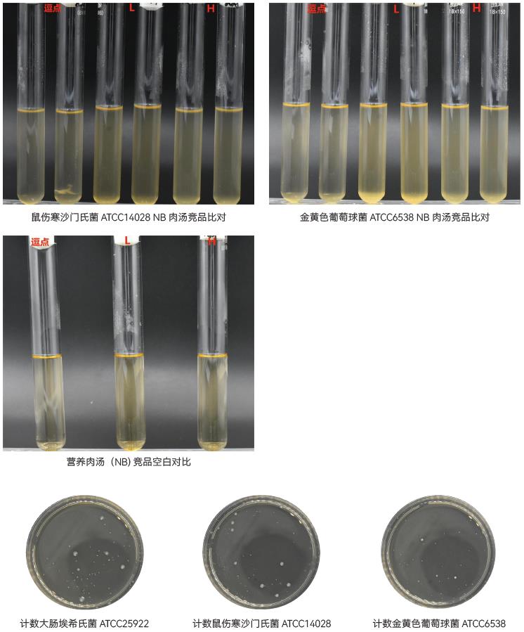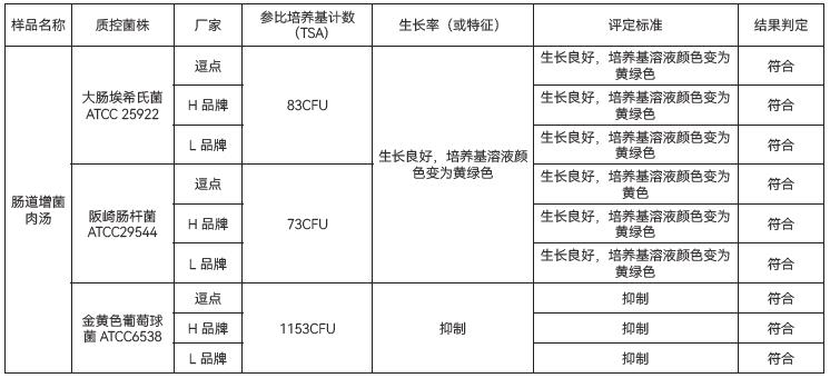 1、生长率:目标菌大肠埃希氏菌ATCC25922 、鼠伤寒沙门氏菌 ATCC14028、金黄色葡萄球菌 ATCC6538,逗点、L品牌、H品牌的混浊度 、生长现象均满足要求;24±2h培养后浑浊度均达到2。