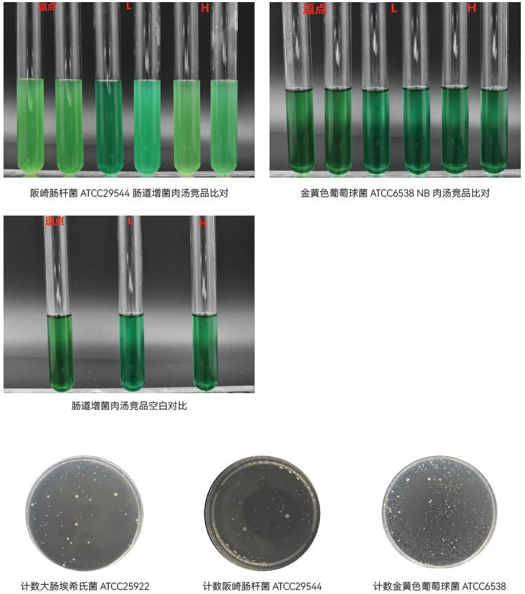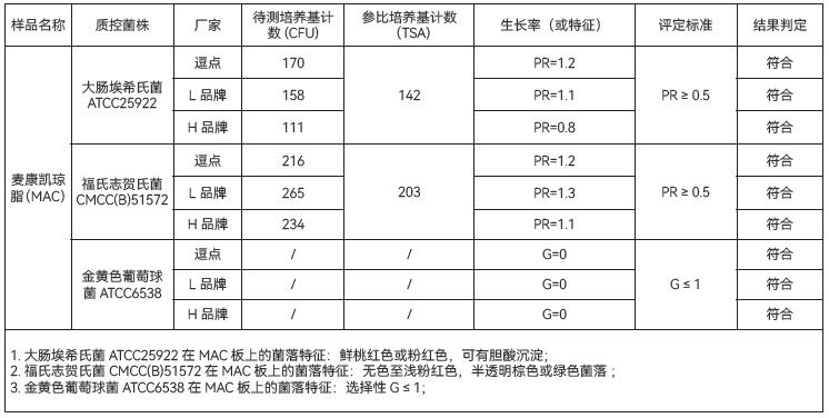 1.生长率:目标菌大肠埃希氏菌ATCC25922,逗点、L品牌、H品牌均满足国标PR≥0.5的要求; 福氏志贺氏菌 CMCC(B)51572,逗点、L品牌、H品牌均满足国标PR≥0.5的要求。