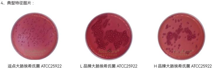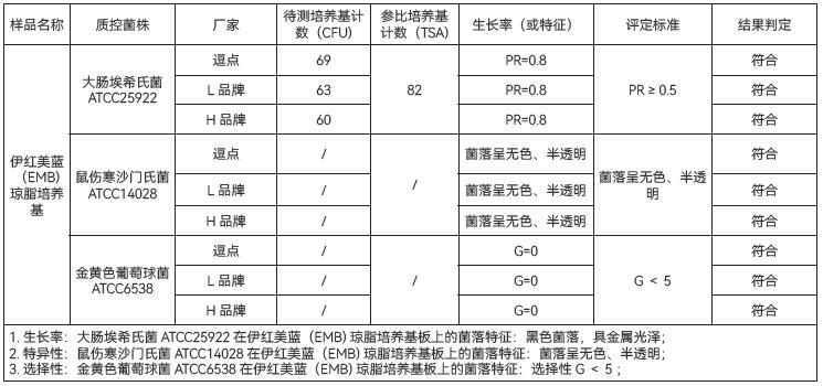 1、生长率:目标菌大肠埃希氏菌 ATCC25922,逗点、L品牌、H品牌均满足国标PR≥0.5;黑色菌落,具金属光泽的要求;且三家无明显差异。