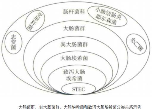 大肠菌群,是指在36℃培养条件下能发酵乳糖、产酸产气的需氧和兼性厌氧革兰阴性无芽胞杆菌,其可能来自人类和温血动物的肠道及自然环境,包括埃希菌属、柠檬酸菌属、克雷伯菌属和肠杆菌属等;粪大肠菌群,又称耐热大肠菌群,是一群在44.5℃培养24~48小时能发酵乳糖、产酸产气的需氧和兼性厌氧革兰阴性无芽胞杆菌,主要由大肠埃希菌组成,还包括与粪便污染无直接相关性的其他菌株,如肺炎克雷伯菌;大肠埃希菌隶属肠杆菌科埃希菌属,其广泛存在于人和温血动物的肠道中,是革兰阴性无芽胞杆菌,能够在44.5℃发酵乳糖产酸产气,IMViC生化试验结果为“++--”或“-+--”;致泻大肠埃希菌是一类能引起人体以腹泻症状为主的大肠埃希菌,主要包括肠道致病性大肠埃希菌、肠道侵袭性大肠埃希菌、产肠毒素大肠埃希菌、产志贺毒素大肠埃希菌(包括肠道出血性大肠埃希菌)和肠道集聚性大肠埃希菌。下图显示了大肠菌群、粪大肠菌群、大肠埃希菌和致泻大肠埃希菌的分类关系。