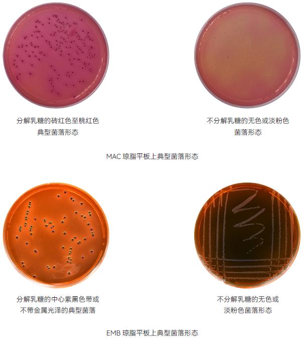 2.4.2 培养结束后,观察菌落特征。在MAC琼脂平板上,分解乳糖的典型菌落为砖红色至桃红色,不分解乳糖的菌落为无色或淡粉色;在EMB琼脂平板上,分解乳糖的典型菌落为中心紫黑色带或不带金属光泽,不分解乳糖的菌落为无色或淡粉色。