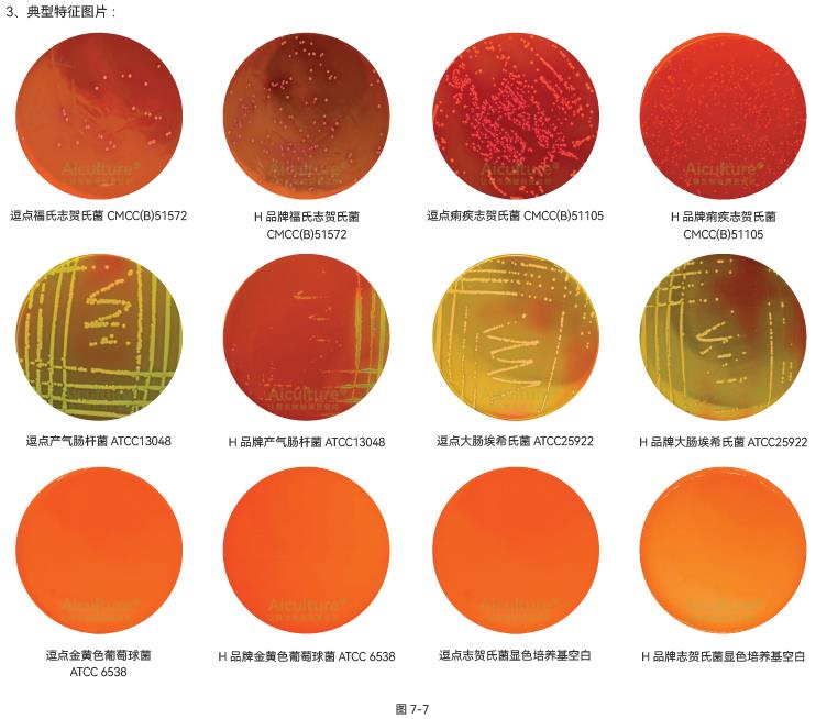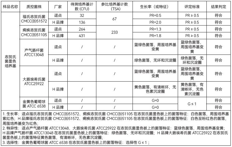 4.3 特异性:产气肠杆菌 ATCC13048、痢疾志贺氏菌 CMCC(B)51105 逗点、H 品牌均满足菌落颜色特征要求。