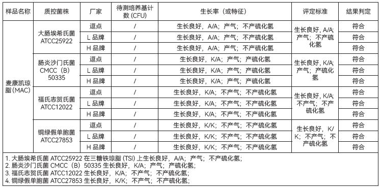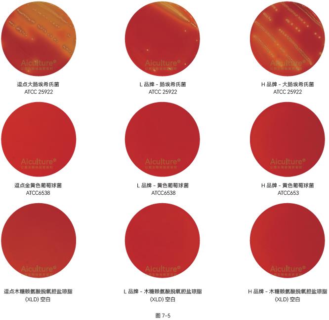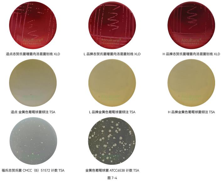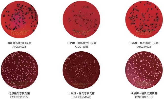 4.1 生长率:目标菌福氏志贺氏菌 CMCC(B)51572+ 金黄色葡萄球菌 ATCC6538,逗点、L 品牌、H 品牌均满足国标在XLD 上> 10CFU,