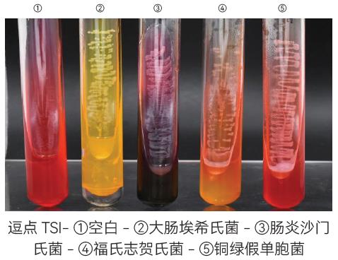①斜面产碱呈红色且底层产酸呈黄色(发酵葡萄糖,不发酵乳糖、蔗糖);