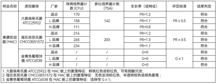 4.1 生长率:目标菌大肠埃希氏菌ATCC25922,逗点、L 品牌、H 品牌均满足国标PR ≥ 0.5 的要求,H 品牌、L 品牌有明显胆酸盐沉淀,目标菌落较大,逗点无胆酸盐沉淀,标菌落较小; 福氏志贺氏菌 CMCC(B)51572,逗点、品牌、H 品牌均满足国标PR ≥ 0.5 的要求。