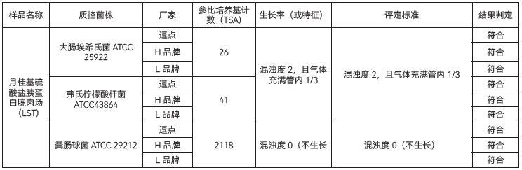 4.1生长率:目标菌大肠埃希氏菌ATCC25922 、弗氏柠檬酸杆菌ATCC43864、逗点、L品牌、H品牌的混浊度、产气均满足要求;