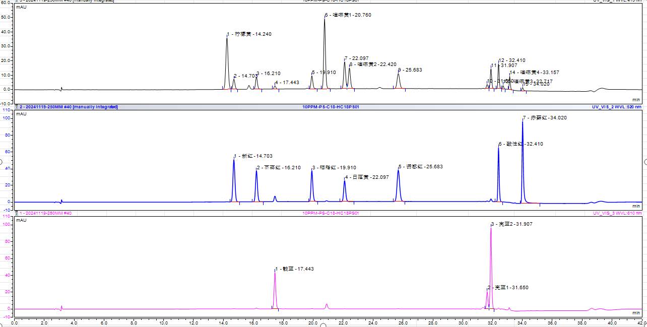 520nm:1.新红 2.苋菜红 3.胭脂红 4.日活黄 5.诱惑红 6.酸性红 7.赤藓红
